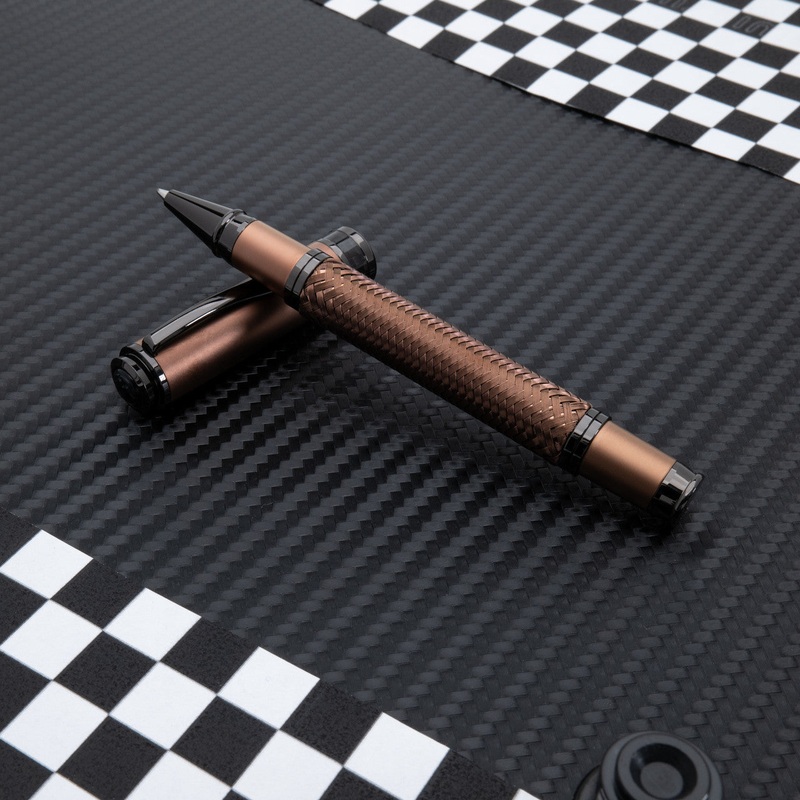 The Monteverde Innova Formula M is an extraordinary writing instrument collection that combines unique materials and cutting edge designs that will entice not only pen aficionados, but anyone who dreams of life in the fast lane. Inspired by the racing industry, the Monteverde Innova Formula M collection evokes the power, speed and elegance of competition. All pens in the collection feature a 304 wire-braided stainless steel sleeve with PVD coating over a brass barrel. Wire braiding is often fitted on high-performance cars as it offers the best possible protection against mechanical damage. The braided mesh is made by winding wire around a core on spools that are rapidly rotated in a circular pattern, weaving the wire together and molding it into a flexible and robust braid. 304 wire-braided meshs advantage lays in its incredible durability and resistance against UV rays, abrasion, and chemical corrosion, making it virtually indestructible. Each writing instrument is fully-covered with matte PVD coating, providing key performance features while giving additional vibrancy, luster, and durability. PVD (Physical Vapor Deposition) is a process that uses diverse thin film deposition techniques that focus on vaporizing a solid material in a vacuum environment, resulting in deposition onto the surface as a pure material coating. This material coating is appealing to the eye but also extremely durable, can reduce friction and serve as a barrier against any potential damage caused by the external environment and usage of the product. Moreover, PVD coating is highly resistant to tarnishing and corrosion, which makes it perfectly suitable for decorative finishes with colors that do not fade. Each pen features cap and a front sections made from sold brass and coated with matte PVD. A unique and attractive CARBON FIBER RING offsets the gunmetal appointments and completes the racy design. The Innova Formula M collection offers three color options: PVD black, PVD blue, and PVD bronze and is available as either fountain pen, rollerball pen or ballpoint pen. The fountain pen is equipped with a premium stainless steel #6 JoWo nib engraved with the Monteverde USA logo and fills via standard cartridge or converter (included). The nib is available in Extra Fine, Fine, Medium, Broad, 1.1mm Stub and Omniflex point sizes. The capped rollerball accepts standard international rollerball refills (Monteverde G2 and W2 rollerball refills). The twist action ballpoint fills with standard Parker style refills (Monteverde P1 and P4 ballpoint refills). Each Innova Formula M pen is housed in a luxury gift box with a custom-designed sleeve.