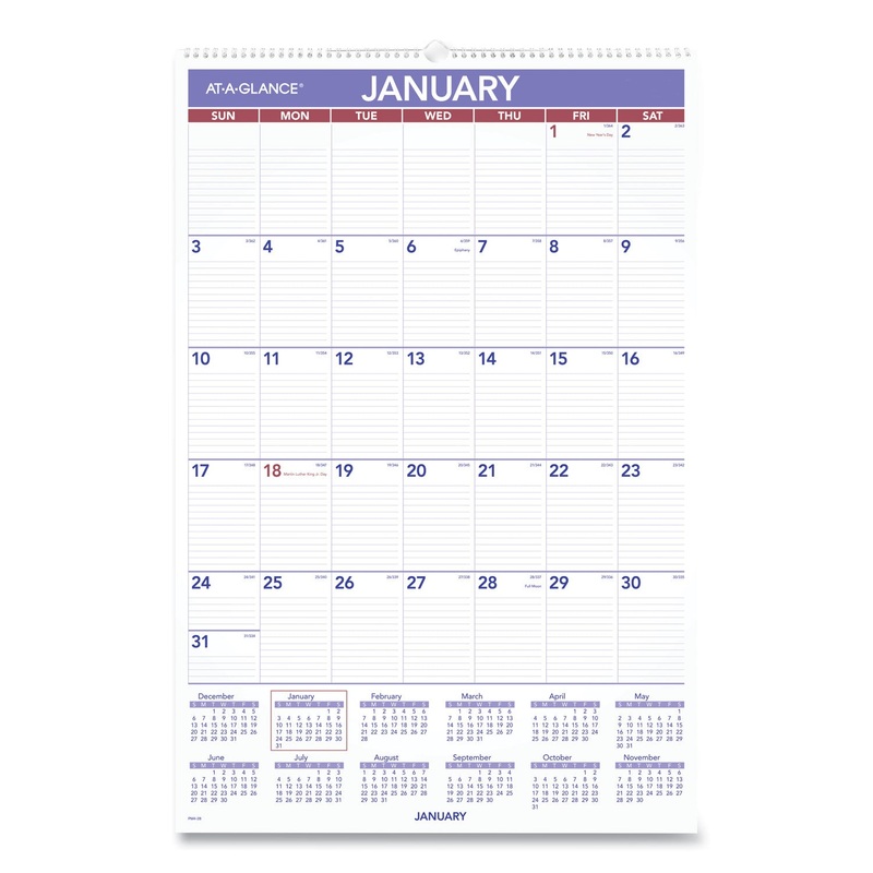 One-month view, plus a yearly calendar reference. Ruled daily blocks. Federal holidays printed in red. Wirebound with hanging loop. Full chipboard back. Printed on high-quality paper. Dated/Undated: Dated; Calendar Format: Monthly; Page Format: One Month p