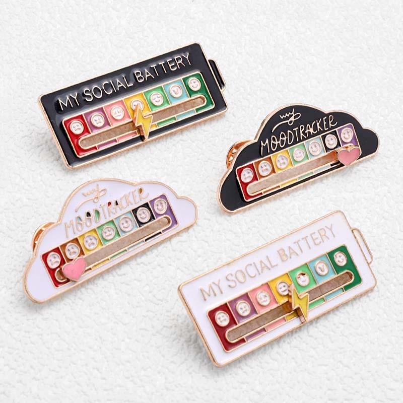 Why Youll Love It: Interactive & Fun Slide to match your current mood or energy level. 2 Unique Designs Choose from My Social Battery (Battery Shape) or My Mood Tracker (Cloud Shape). 2 Classic Colors Available in sleek black or white. Durable Alloy Material Glossy finish with a high-quality look and feel. Secure Fit Comes with two butterfly clutches to keep it in place on your clothes, bag, or lanyard.