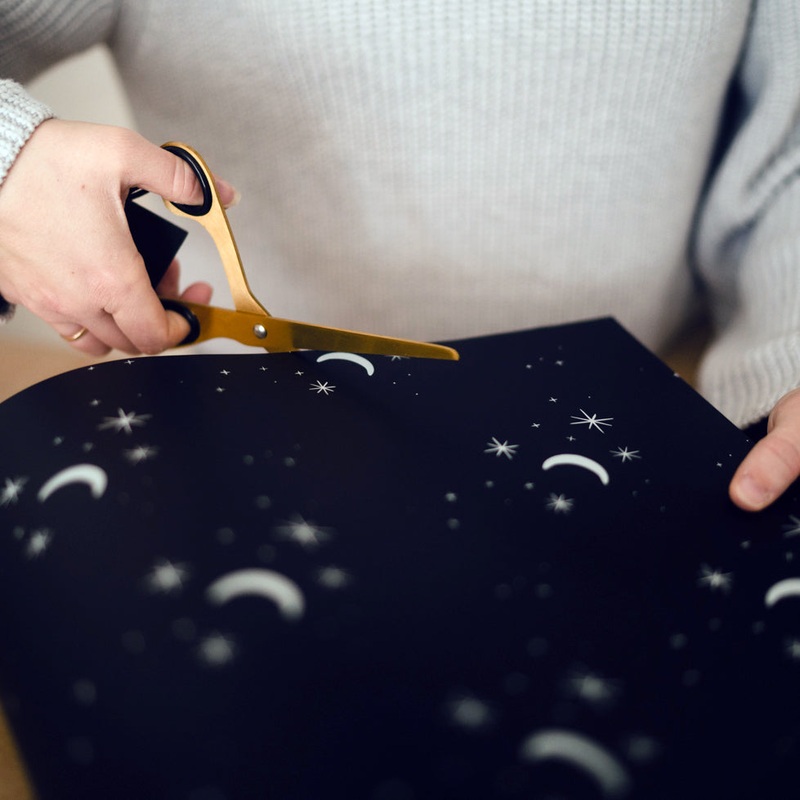 Moons Gift Wrap Designed in Belfast, printed in the UK on luxuriously thick 110gsm soft white uncoated FSC certified paper. Fully recyclable, please do recycle after use! Dimensions - 500mm x 700mm Sold assinglesheets, carefully folded for postage