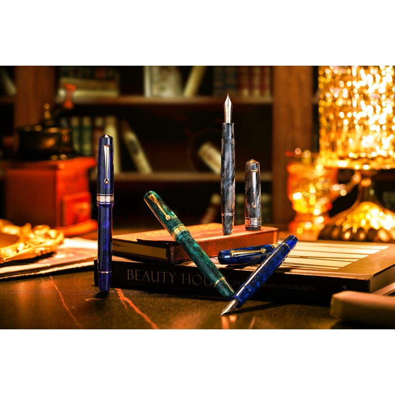 The Bologna has been created in four striking colors of Diamoncast resin: Azzurro Diamante (Diamond Blue), Smeraldo Elegante (Elegant Emerald), Grigio Luminoso (Bright Gray) and Ametista Profondo (Deep Amethyst). The colors are created to mimic the original Omas celluloid created in 1930s.