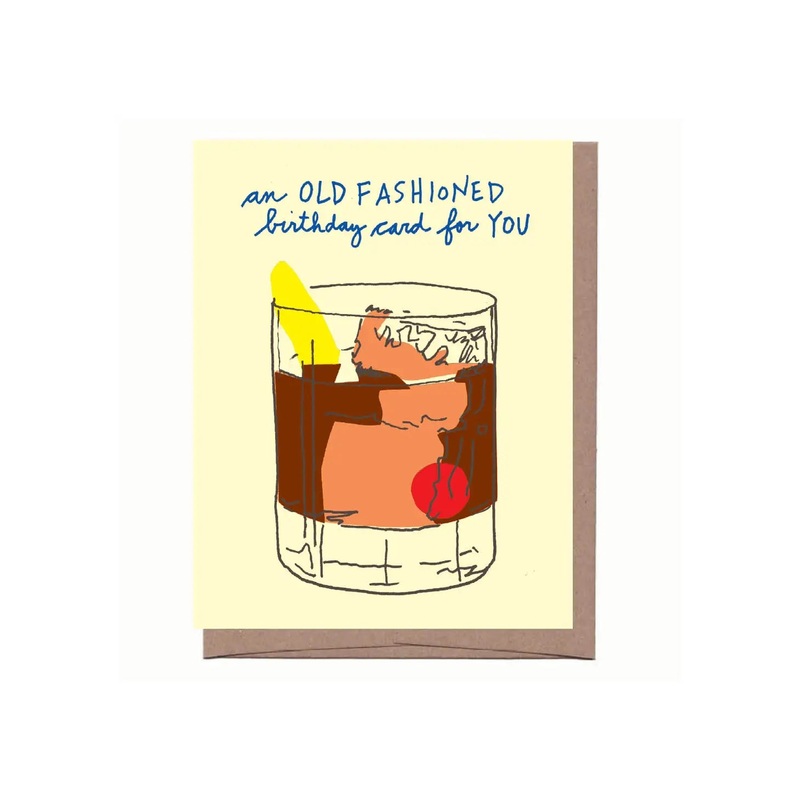 Bourbon and nostalgia enthusiasts rejoice! An old fashioned birthday card for you!Size: 4.25" x 5.5" folded cardBlank insideFlat printed on FSC certified paper from an original handcut collage, drawing, or print.recycled kraft envelope.