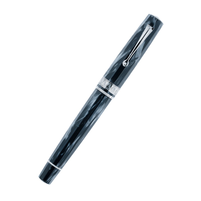 Grigio Perla celluloid first came onto the market after production was finished in the year 1932. Although it was featured heavily on pens of the time, when customers tended to prefer monochrome pens, Grigio Perla really started to shine with the release of the Cinema pen. The Cinema was released to commemorate the 100th anniversary of the birth date of modern cinema in 1995, paying homage to the fact that film itself is likewise created with cellulose nitrate. Nearly thirty years later, the material can shine again. 88 units of Paragon have been carved out of this understatedly beautiful celluloid and, for the first time, has been married to black ruthenium plated furniture and nibs.