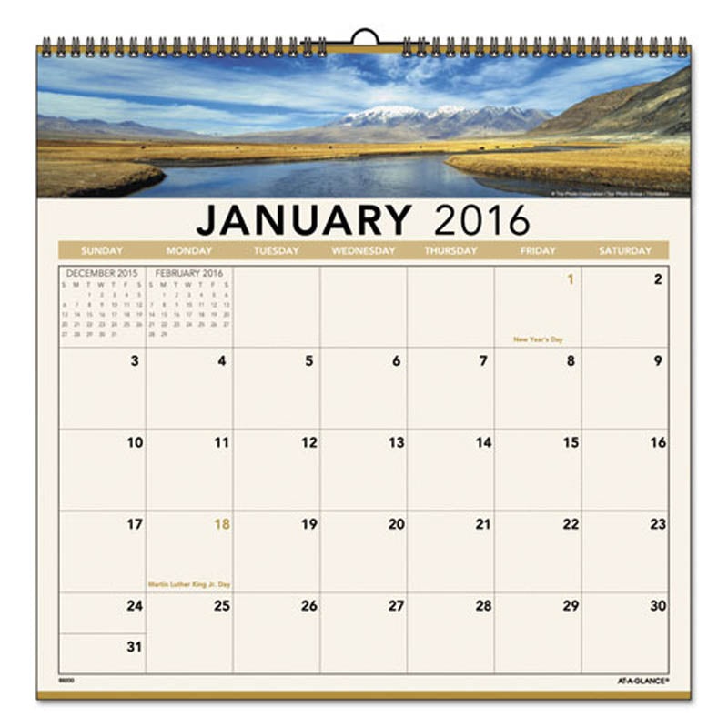 FeaturesExplore a different picturesque landscape each month.Features full-color photos.One month per page with unruled blocks.Past and future months reference; Federal holidays highlighted.White wirebound with hanging loop.DetailsExplore a different pictu