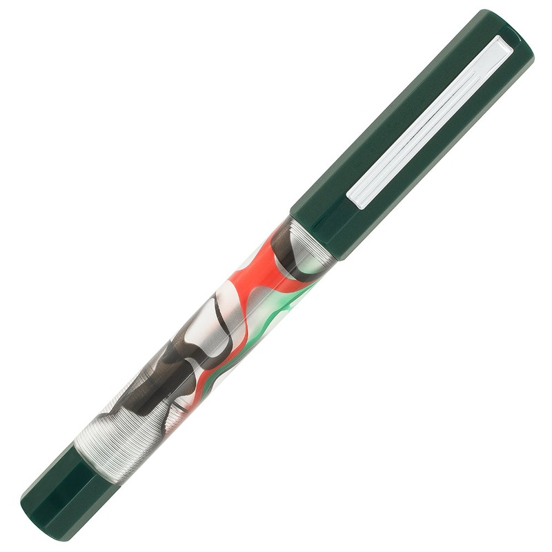 Thislarge fountain penfeaturesopaque swirls ofblack, red, andgreen ribbon on a transparent body,with accenting solidgreen acrylic cap and end piece.The pen is an eyedropper filler with a shut-off valve mechanismdesigned to prevent ink from leaking or dryin