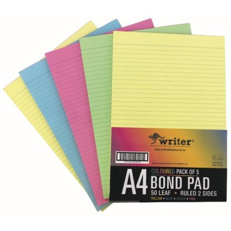 514X1S4WPAD WRITER A4 BOND 2 SIDED RULED ASST COLS 50LF PK5 G41886