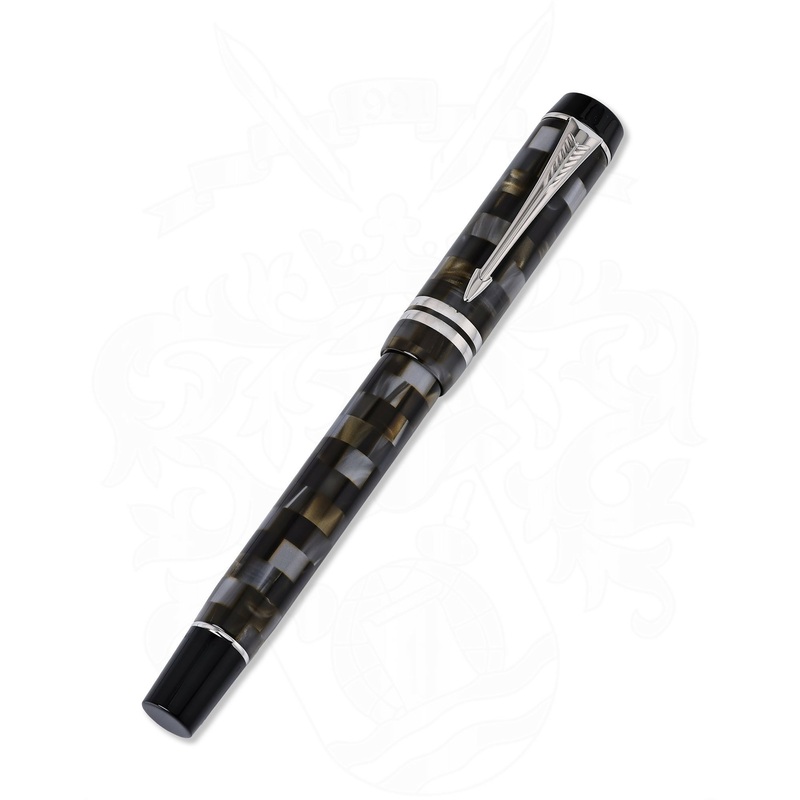 The Demi represents the smallest modern Duofold size, measuring 11.6 cm when capped. The Check Olive finish presents a visually striking combination of green, grey, and black tones. The pen is finished with rhodium-plated trim.