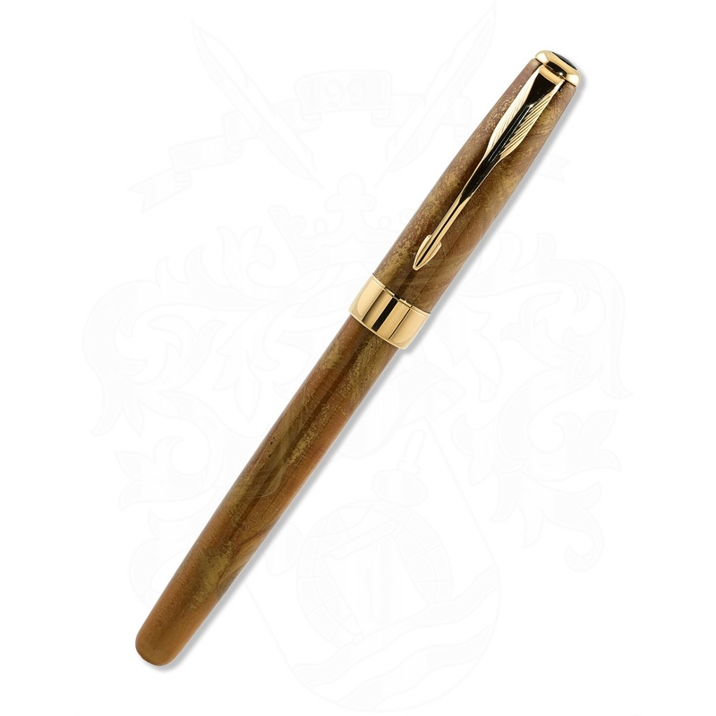This Parker Sonnet Fountain Pen in amber Chinese lacquer is a sophisticated writing instrument that combines elegance and functionality. Its warm amber lacquer finish is complemented by intricate gold-plated accents, lending a refined touch to the pens design.