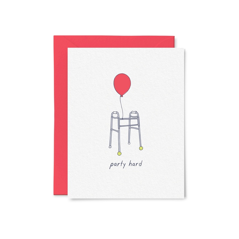 Never too old to party hard. Size: A2 folded, 4 1/4" x 5 1/2"Blank inside for your personal messageFlat PrintedPaper: 110lb felted paper