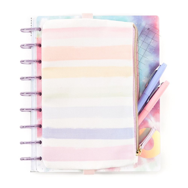 Pastel perfection! Keep all your planning necessities on hand. This canvas pouch features a pastel stripe print with a contrast pink band that wraps on your Happy Planner covers. The zip closure will keep your pens, sticky notes, and washi tape safe! Canva