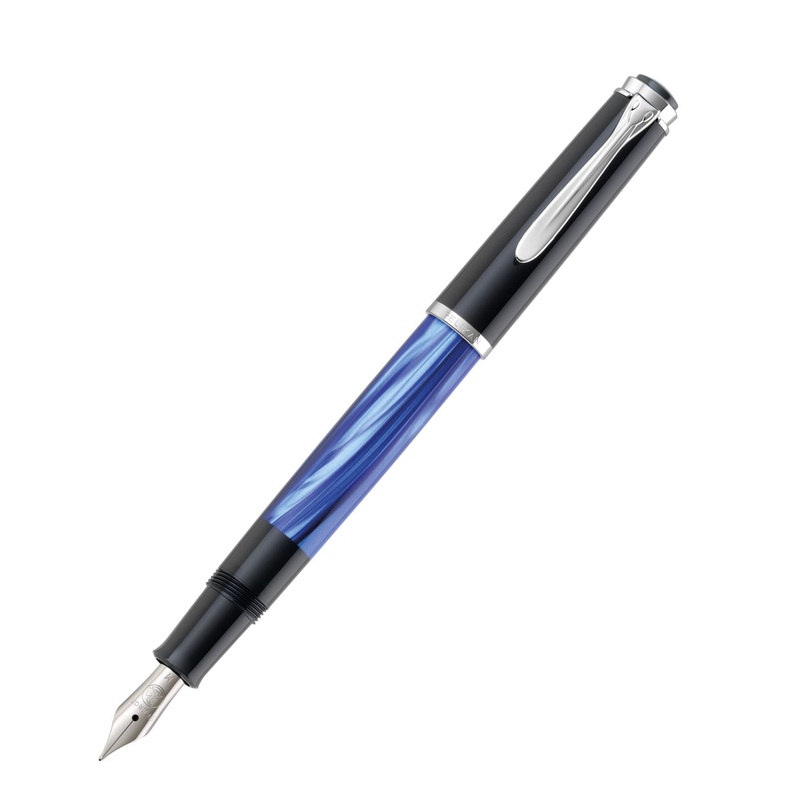 The writing instruments in these series are the epitome of classical writing culture. Featuring a perfect appearance with an unmistakable Pelikan design, they form the elegant writing instruments of our timeless, beautiful Classic series. The shimmering marbled material of the casing is different with every writing instrument. All highlights, like the traditional beak-like clip and the rings are silver chrome-plated. The fountain pen with piston filling mechanism provides a polished stainless steel nib and is available with the nib sizes EF, F, M or B. The EF nib creates an extra fine typeface and is suitable for handwritings with small swings.