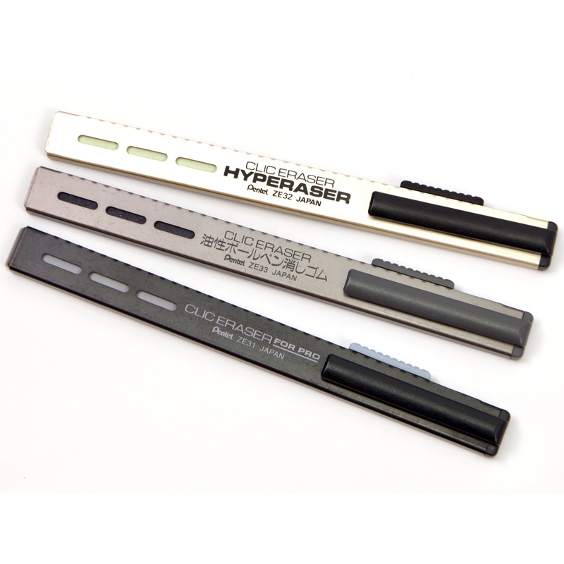 The Pentel Clic Eraser is a thin holder-type eraser that is easy to carry in your pen case. This eraser comes in options beyond erasing pencil marks! The Pentel Clic Eraser comes in three types: Clic Eraser Pro for Mechanical Pencil, Clic Eraser Sand for O