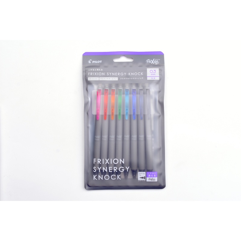 Pilot FriXion Synergy Knock. The Synergy Knock line of Pilot FriXion ballpoint pens introduces an innovative “Synergy tip” that combines two types of metal tips typically available for ballpoint pens – the “cone” tip, which is sturdy and provides a stable writing experience, and the “pipe” or needle point tip, which allows for precision. The new proprietary “Synergy” tip from FriXion combines the two conventional tips to create a high strength writing tip with a smooth ink flow, even for very fine writing.The FriXion Synergy Knock pen has a matte gray barrel that is smooth and comfortable to grip, with a pen clip that matches the color of the ink. The FriXion eraser on the end of the pen body comes in a different color for 0.5, 0.4, and 0.3 mm diameters, making it easy to distinguish the point size of your pens in your pencil case. Since the ink reacts directly to temperature, it is recommended not to leave it under direct sunlight or in environments hotter than 140 Fahrenheit.