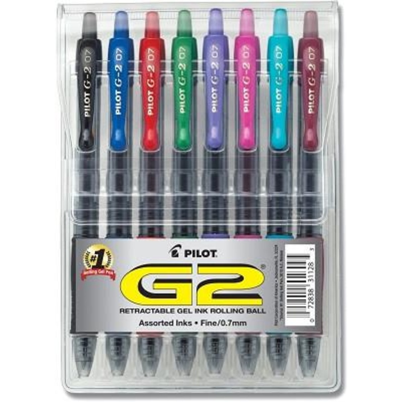 The Pilot G2 is the worlds #1 Pen. These packs feature 8 different colorsColors: Black, Blue, Red, Green, Purple, Pink, Aqua, BurgundySize: Fine (.7mm)