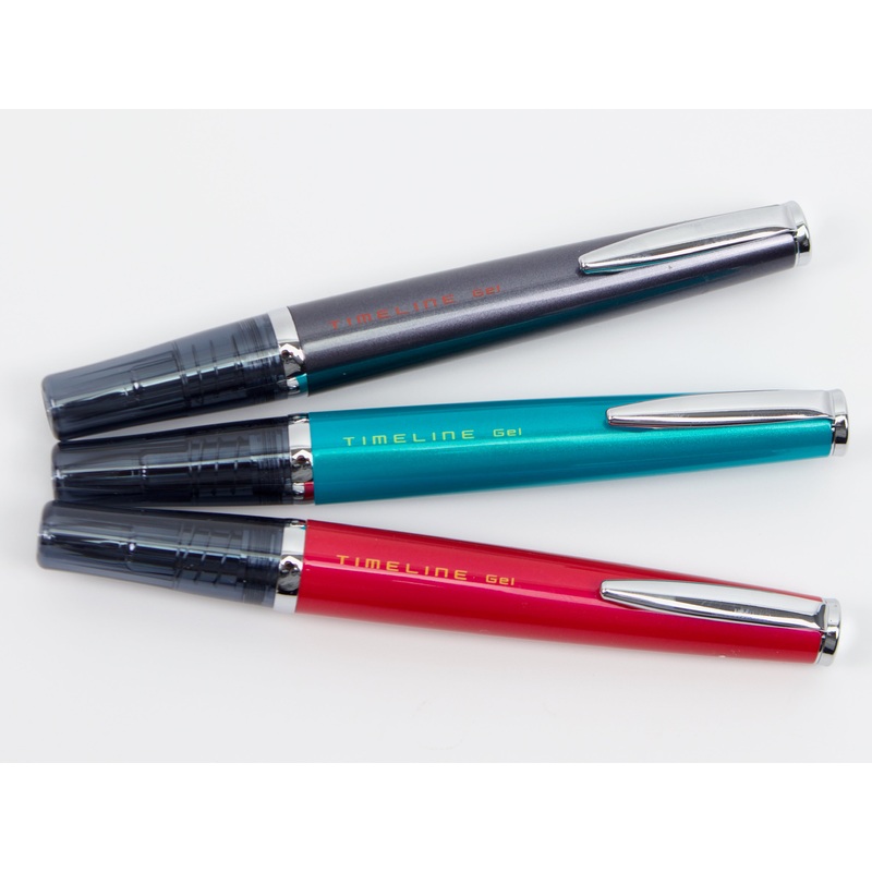 The Pilot Timeline has a bold futuristic design that hides itsnib. Simply twist to reveal it and write. Available in carbon black, peacock green, and rose pink. The Timeline Gel comes with a juicy .5mm black gel ink, and is refillable with both the Timelin