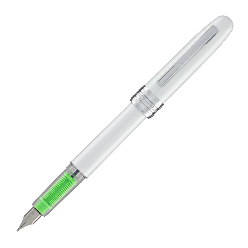 To express the pen’s aura, Platinum layered polarized pearl on white-painted aluminum that shines with a fascinating radiance. The finish looks different depending on the light. Platinum matches the pearlized color of the pen body with a matching ABS feeder that can be seen through the clear grip section.