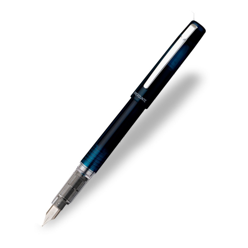About Platinum Prefounte Fountain Pen -Graphite Blue The Platinum Prefounte fountain penhas simple lines from a design inspired by sophisticated urban images.The Prefounte fountain penhas a translucent cap and barrel, a hi-tech feed system to ensure reliab