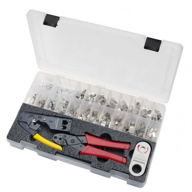 PLATINUM TOOLS 10G Termination Kit. Kit includes: Tele-Titan crimp tool for Cat6A plugs. 100pc Cat6A plugs. Cyclops2 cable jacket stripper. CT-360 external ground crimp tool.