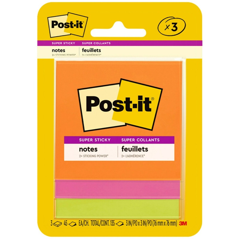 Post-it Super Sticky Note Pads – Energy Boost Color Collection – 135 – 3″ x 3″ – Square – 45 Sheets per Pad – Unruled – Vital Orange, Tropical Pink, Limeade – Paper – Self-adhesive – 3 / Pack
