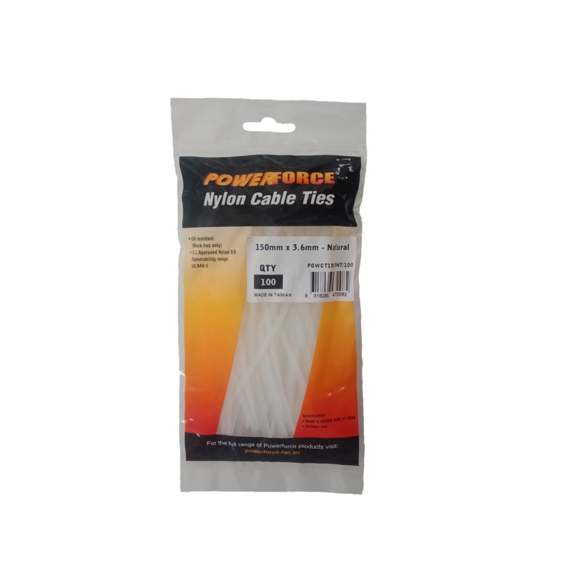 POWERFORCE Cable Tie Natural 150mm x 3.6mm Nylon Pack of 100. Made from U.L. Approved Nylon 6/6 with Flamability Rating of UL 94V-2FeaturesNatural nylon - made from U.L. approved nylon 6/6.Flammability rating - UL 94V-2.Weather Resistant Nylon (Black UV) -