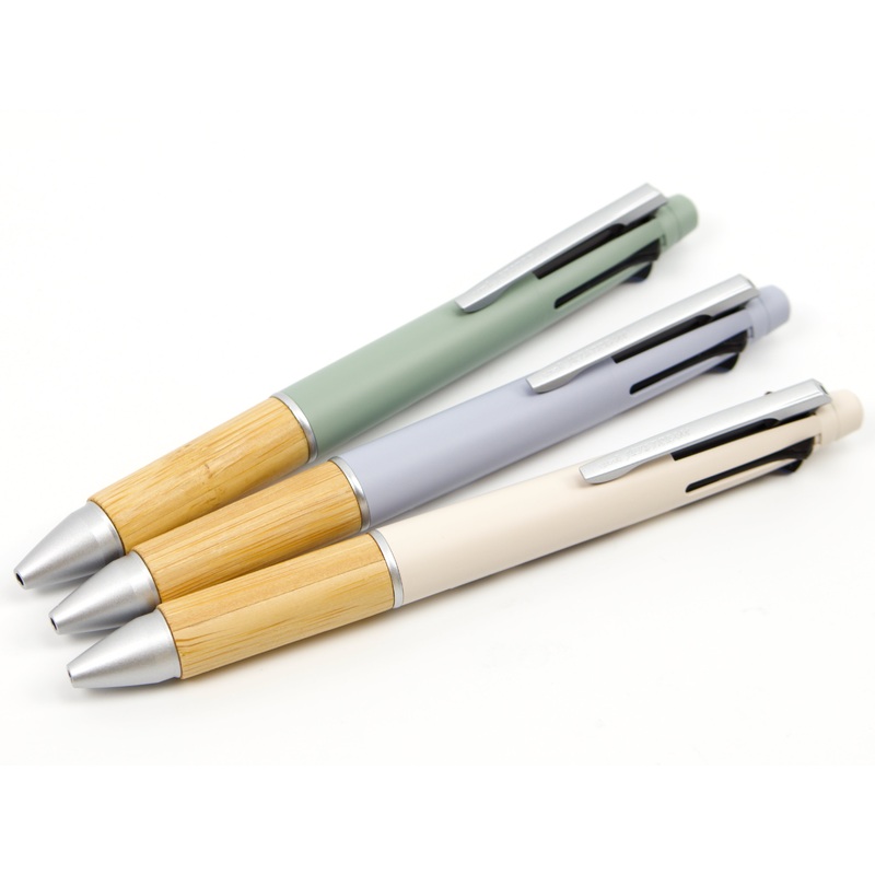Uni Jetstream 4 1 featuring a matte body inspired by colors in nature with a light and beautiful natural bamboo grip. The Jetstream 4 1 includes four colors of .5 ink (black, blue, red, green) and a .5 mechanical pencil.Sustainable bamboo gripThe quick-dry