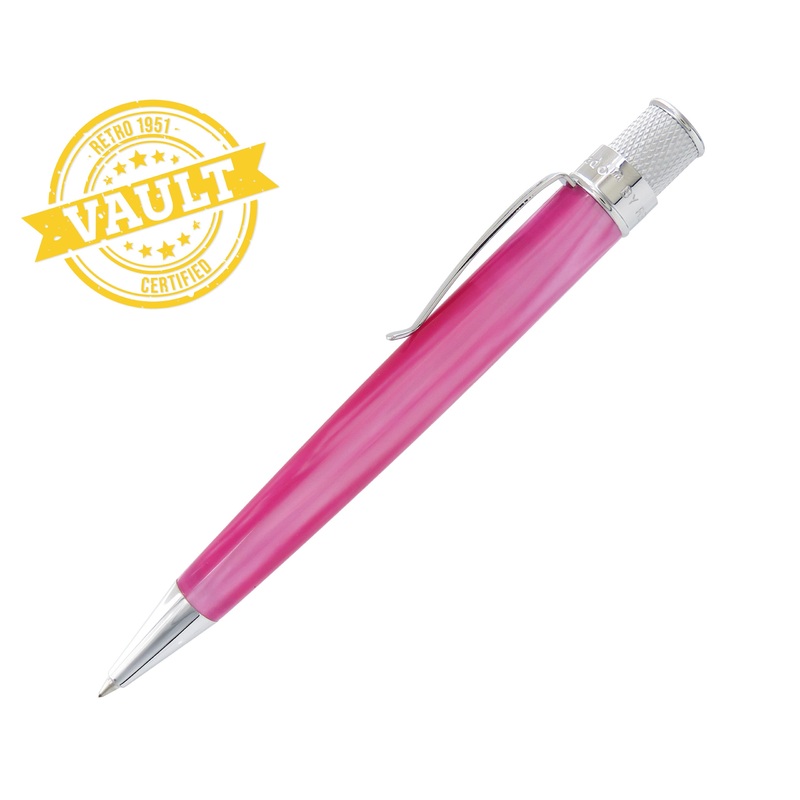 A sweet swirl of nostalgia returns from the Retro51 Vault! Originally released in 2009, the Pink Cotton Candy Acrylic Tornado is back while supplies last, bringing its playful charm and eye-catching color back to collectors and fans alike. Crafted from vibrant pink acrylic, this pen features a mesmerizing blend of soft blush and rich bubblegum tones,swirling together like a spun-sugar treat. Each barrel has a unique pattern, ensuring no two pens are exactly alike. The polished chrome accents provide a sleek contrast, making this a standout piece for both writing and collecting.