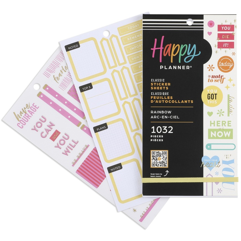 Just be you. This Value Pack Sticker Book has 30 sheets with 1032 stickers. Add these sticker packs to your Classic Happy Planner, guided journal, notebook, Memory Keeping Journal, or bullet journal to help you prioritize your tasks and decorate your spreads! Create spreads with all the colors of the rainbow, decorative trims, and memo boxes.