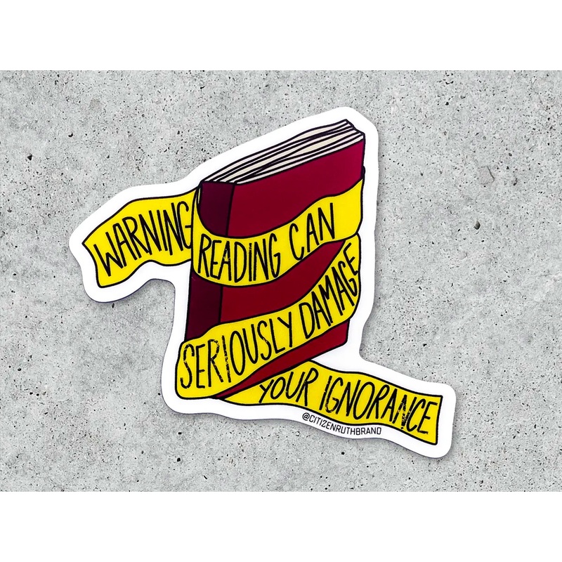 "Reading can seriously damage your ignorance" stickerSticks on your car bumper, computer, notebooks, or wherever.Thickadhesive vinylSize approx:2.5" x 3"WaterproofUV coated to prevent fadingMade in USA