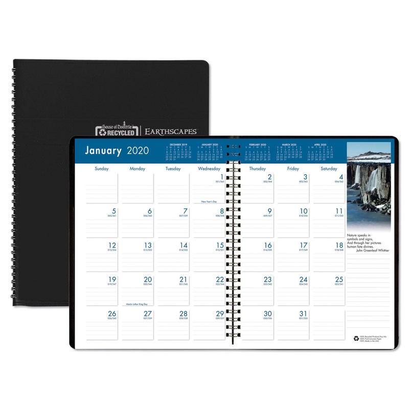 Earthscapes 100% recycled monthly planner features a full-color nature scene with a quote to inspire on each spread. Wirebound with a black, embossed, simulated-leather cover to withstand the rigors of daily use throughout the year. Lightly ruled daily blo