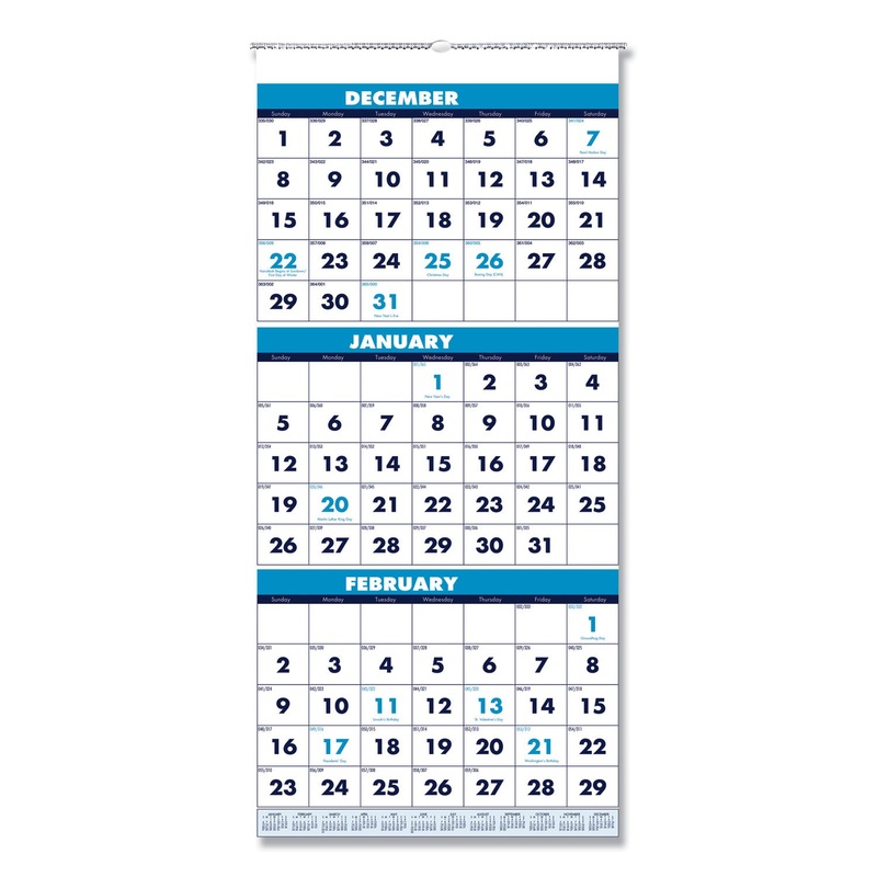 See three months at a time. Wall calendar details the prior, present and following month on each page. Large date numerals with holidays highlighted. Strong wire-binding firmly keeps the pages together and in place. Features a full, 12-month reference calendar for long-term planning. Sturdy wire hanger makes it easy to hang the calendar on the wall. Made entirely of recycled materials. Vertical Format. Dated/Undated: Dated; Calendar Format: Quarterly; Page Format: Vertical: One Quarter per Page; Edition Year: 2023 to 2025.