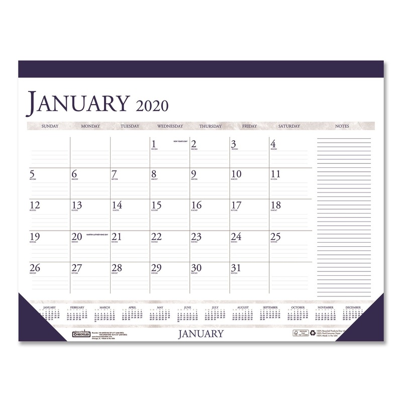 RECYCLED TWO-COLOR MONTHLY DESK PAD CALENDAR W/LARGE NOTES SECTION, 22X17, 2020