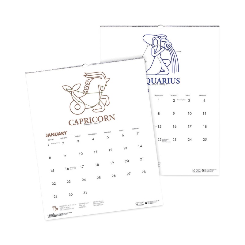 House of Doolittle Recycled Zodiac Wall Calendar has a clean open space design. Each month the zodiac symbol along with the star pattern is displayed with the astrological time frame of the month. It also displays information about the astrological sign wh