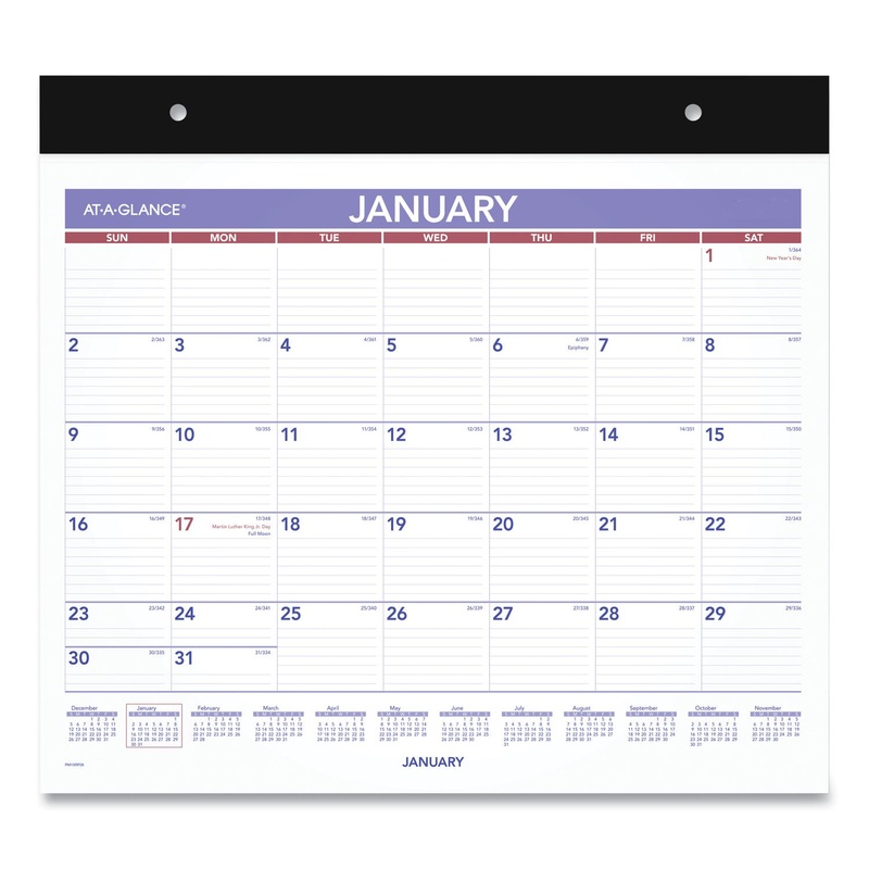 Calendar covers 12 months from January to December with Julian dates for a full year of planning. High-quality paper features superior ink bleed resistance. One month-per-page format has ruled daily blocks for jotting down notes, reminders and important ev