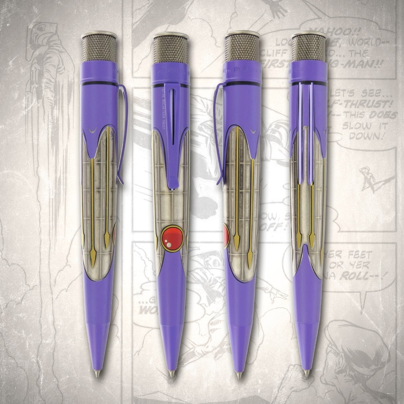 Your Rocketeer collection wouldnt be complete without the rocket-pack! This clever design utilizes the extra girth of the Big Shot rollerballs body to depict the original rocket in all its purple glory! Complete with acid-etched details, stonewashed pewter accents, and a fiery top disc this pulpy, comic-accurate representation of the rocket will set your collection ablaze.Limited Edition of 800. Each pen is numbered on the top ring and comes packaged in a custom black tube with gold foil stamped art!