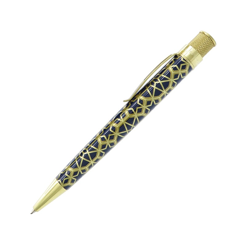 The Geometric Penis decorated with elegant design inspired by Islamic architectural elements. Each writing instrument has a brass barrel with gold and navy blue revealing layers of these intricate design, covered with a gloss varnish. The MET Rollerballisp