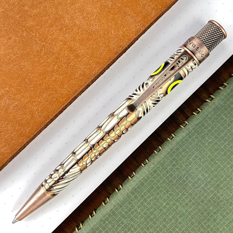 HooHoo...Who?Retro is excited to add the Owl Rescue to this Rescue collection! This Tornado Ballpoint features the image of a burrowing owl through a multi-step process. First the barrel has been acid-etched, followed by a copper plated finish, and finally