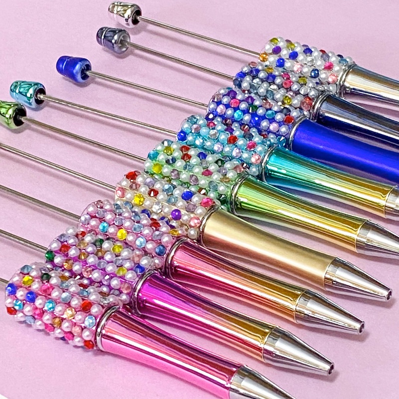 Build your own pen! Each sparkly pen base is set all around with many small sparkly rhinestones and half pearls. It writes in black ballpoint ink. The base twists round to activate the pen. Add to these pen bases with silicone or other jumbo beads.