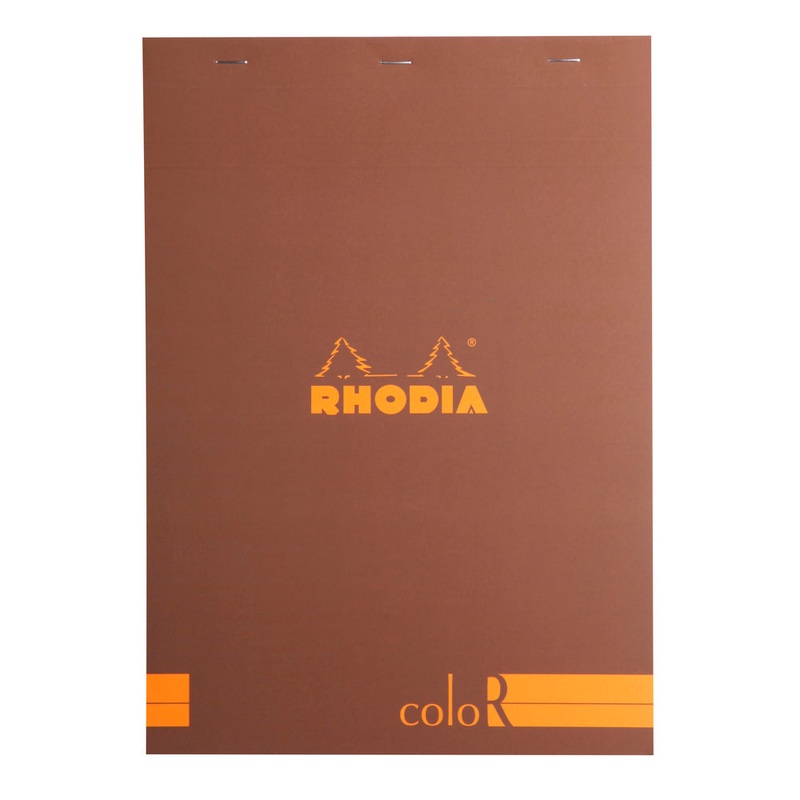 The Rhodia Basics Chocolate Notepad (210X297mm - Lined) 18963C is a lined notepad that measures 210mm by 297mm, or approximately 8.3 inches by 11.7 inches. The notepad features a unique chocolate-colored cover and contains 140 pages of 90gsm Ivory high-qua