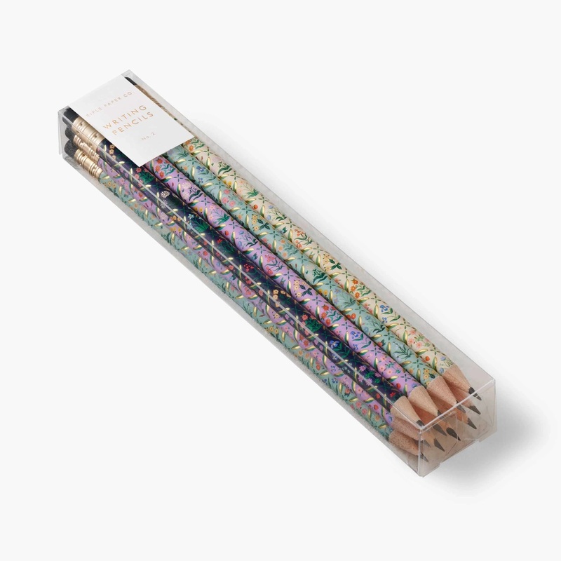Bring a pop of pattern and a touch of gold foil to your morning crosswords or pop quizzes. Our 12-piece, pre-sharpened writing pencil set includes three of each design with black erasers.Wood and graphitePrinted in full colorMetallic gold foilSet of 12
