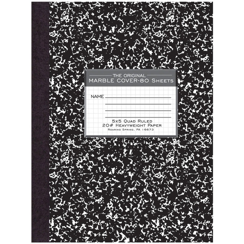 Composition book contains 80 sheets of 15 lb., 5 x 5 quad-ruled paper. Ideal for school lab reports and note-taking. Design features a center-sewn hard cover.