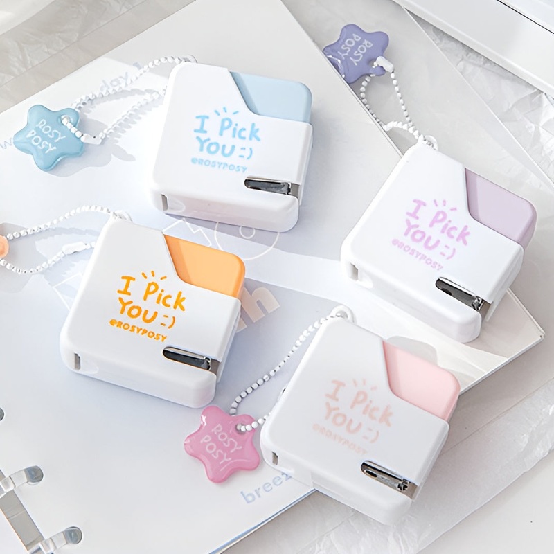 Say hello to your new desk crush the RosyPosy Sugar Cube Stapler! This mini cutie is small in size but big on charm, with soft pastel accents, a matching star-shaped charm, and a playful I Pick You 🙂 print. Just press the colored button to staple, and you’re done! It fits perfectly in your pencil case and staples up to 10 sheets, making it a sweet pick for journaling, school, or your work bag.