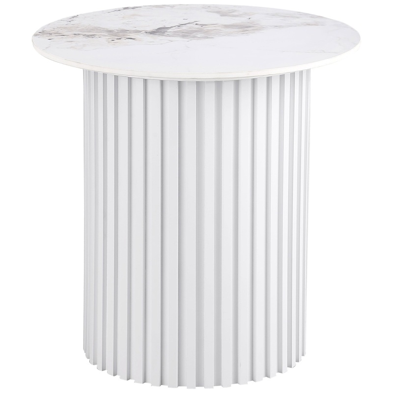 This round end table features a sophisticated sintered stone top with natural veining for a modern and luxurious touch. The sturdy metal base, with its fluted design and white powder-coated finish, delivers both stability and sleek aesthetics. Compact yet