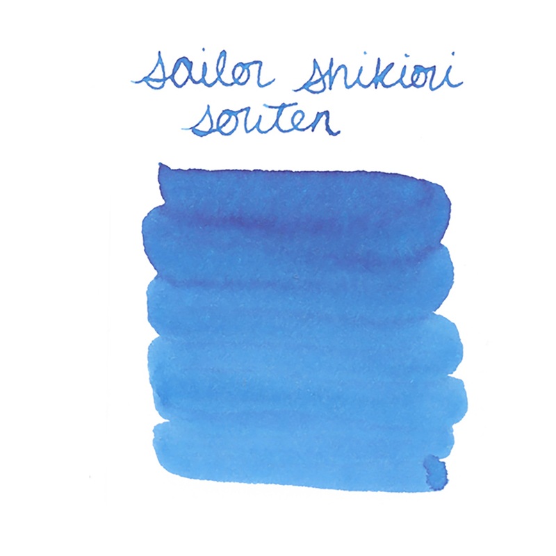 2ml sample of Sailor Shikiori Souten fountain pen ink, in a labeled plastic vial. Souten, or Azure Sky, is a beautiful blue color.Sailor's Shikiori ("Four Seasons") line of fountain pen inks features vibrant and unique colors inspired by the beauty of each