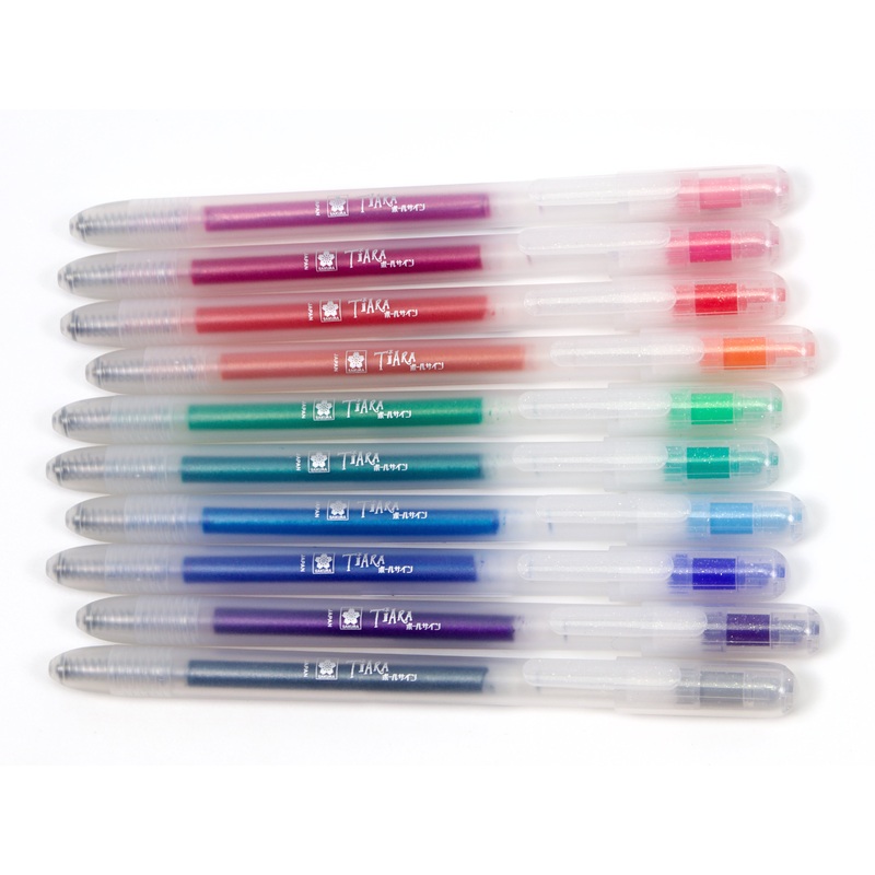 This Sakura Ballsign Tiara knock pen is a sparkly version of the beloved Ballsign pen from Sakura, now in a capless “knock” form! The tip is 1.0 mm, which contributes to the bold look of the shimmery strokes on the page. The proprietary Sakura Aqueous Gel Ink lends this pen a particularly smooth feeling as you write. The knock part of the pen is curved to imitate the original Tiara’s pen cap. These glitter pens are a hit with children and adults alike!