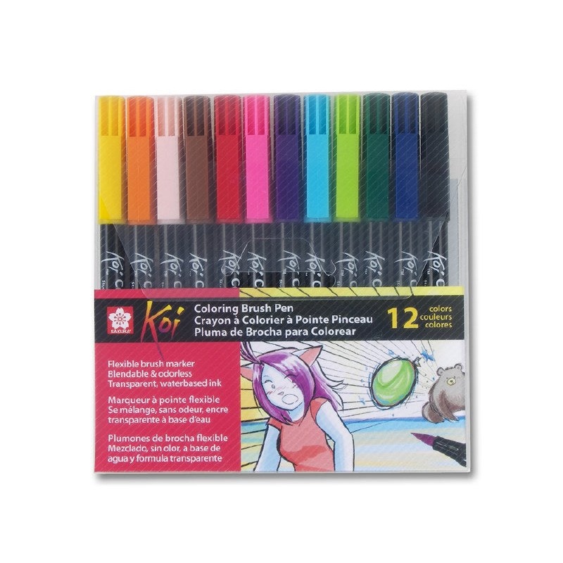 Koi Coloring Brush Pens are great for illustration, journaling, sketching, rubber stamping, architectural drawings, and manga/comic art. They feature a flexible nylon tip and dye-based, water-based ink. For best results use on a heavy weight, plate finishe