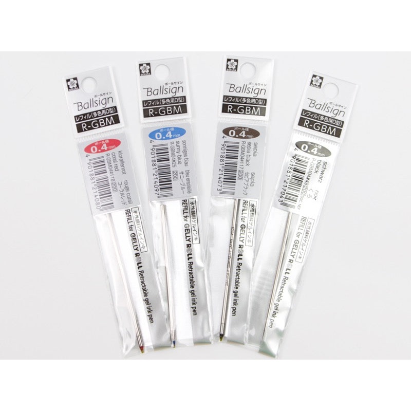 Sakura Ladear refill in .4mm and your choice of black, sepia black, coral red, and sunny blue. Sakura Ballsign gel ink.