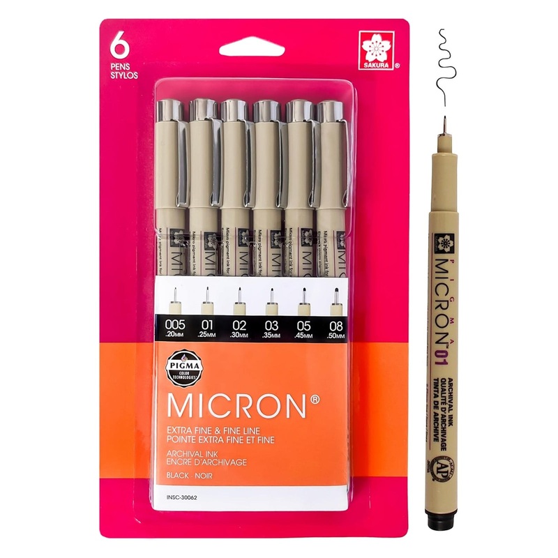 Contains6 black pens in various sizesPens include one each of Micron sizes005 (0.20 mm), 01 (0.25 mm), 02 (0.30 mm), 03 (0.35 mm), 05 (0.45 mm), and 08 (0.50 mm)