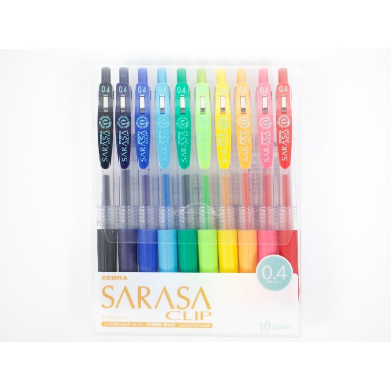 The long time favorite gel ink Zebra Sarasa Clip .4 mm is available in a 10 color set!Each 10 color set includes the following colors: Black, Blue Black, Blue, Pale Blue, Light Blue, Green, Yellow Green, Orange, Pink, and Red.Available in .4 mm tip sizeHig