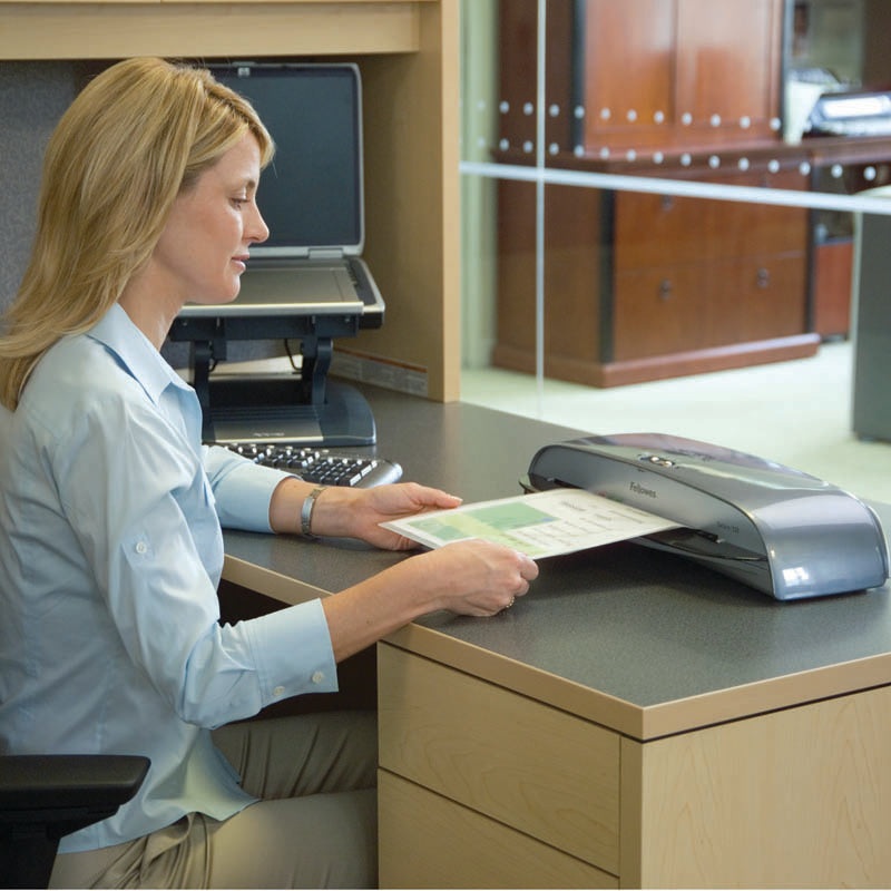 Designed for small office applications. Warms up in one minute with InstaHeat Technology. Accommodates 9-1/2″ wide documents and smaller. Hot lamination for 3-mil or 5-mil pouches and cold setting for laminating self-adhesive pouches. Release lever disengages pouch for re-centering or removal. Auto shut off save energy and prevents overheating. Includes laminating starter kit.