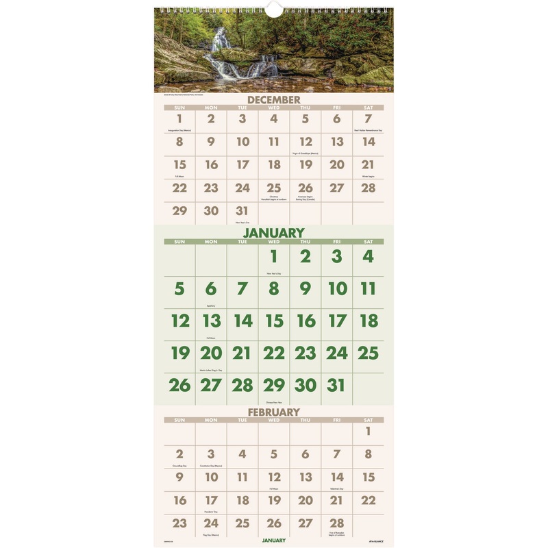Vertical three-month view with scenic photography on each page. Features full-color photos. Three months per page. Bonus page: current-year reference calendar. Chipboard backing; white wirebound with hanging loop. High-quality, paper. Dated/Undated: Dated;